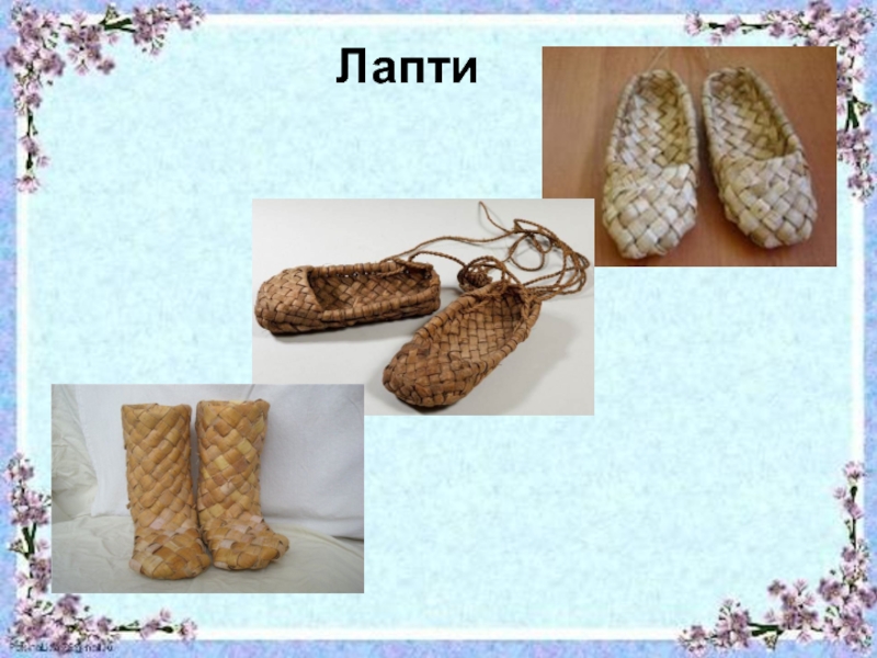 1.Обувь, плетенная из лыка, бересты или