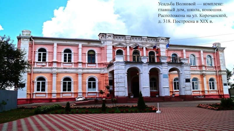 Слайд 9Усадьба Волковой — комплекс: главный дом, школа, конюшня. Расположена на