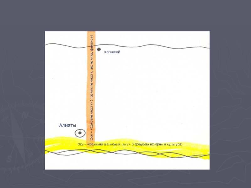 Ось – «Великий шелковый путь» (городская история и культура)КапшагайАлматыОсь – «Современность» (промышленность, экономика, финансы)Ось – «Ландшафт»