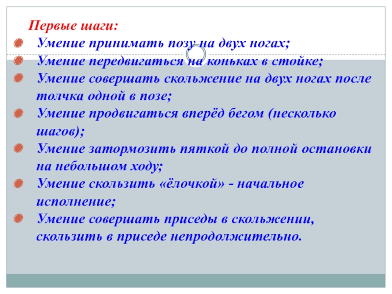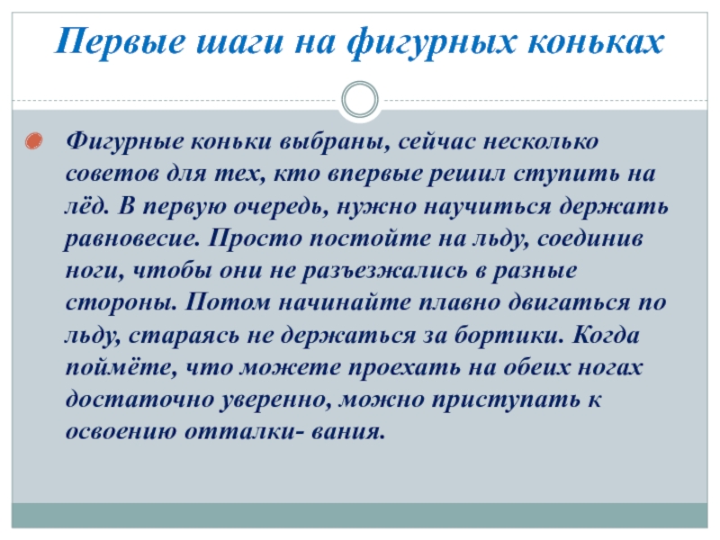 очередь, нужно научиться держать равновесие. Просто постойте на льду, соединив ноги, чтобы они не разъезжались в разные стороны. Потом начинайте плавно двигаться по льду, стараясь не держаться за бортики. Когда поймёте, что можете проехать на обеих ногах достаточно уверенно, можно приступать к освоению отталки- вания.