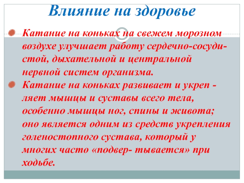коньках развивает и укреп -ляет мышцы и суставы всего тела, особенно мышцы ног, спины и живота; оно является одним из средств укрепления голеностопного сустава, который у многих часто «подвер- тывается» при ходьбе.