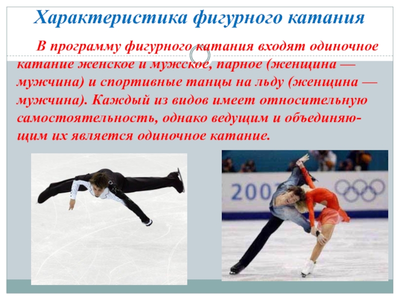 льду (женщина — мужчина). Каждый из видов имеет относительную самостоятельность, однако ведущим и объединяю- щим их является одиночное катание.