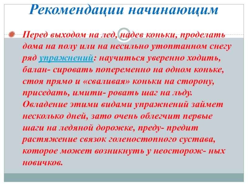 ходить, балан- сировать попеременно на одном коньке, стоя прямо и «сваливая» коньки на сторону, приседать, имити- ровать шаг на льду. Овладение этими видами упражнений займет несколько дней, зато очень облегчит первые шаги на ледяной дорожке, преду- предит растяжение связок голеностопного сустава, которое может возникнуть у неосторож- ных новичков.
