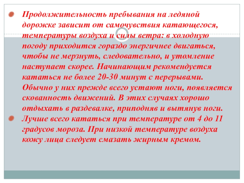 Слайд 10Продолжительность пребывания на ледяной дорожке зависит от самочувствия катающегося, температуры