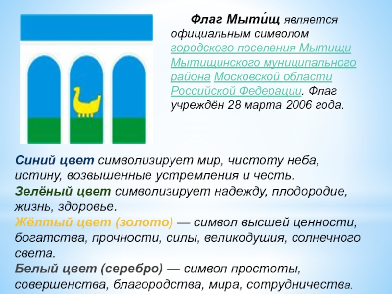 Синий цвет символизирует мир, чистоту неба, истину, возвышенные устремления и честь.