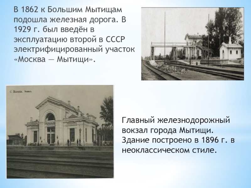 Главный железнодорожный вокзал города Мытищи. Здание построено в 1896 г. в неоклассическом стиле.