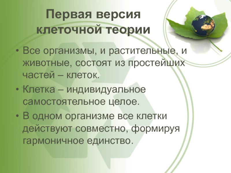 Первая версия клеточной теории Все организмы, и растительные, и животные, состоят из простейших частей – клеток.Клетка –