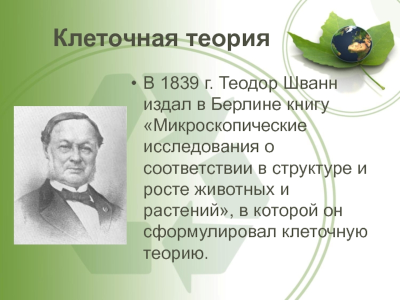 Клеточная теорияВ 1839 г. Теодор Шванн издал в Берлине книгу «Микроскопические исследования о соответствии в структуре и