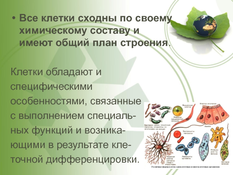 Все клетки сходны по своему химическому составу и имеют общий план строения.Клетки обладают испецифическимиособенностями, связанные с выполнением