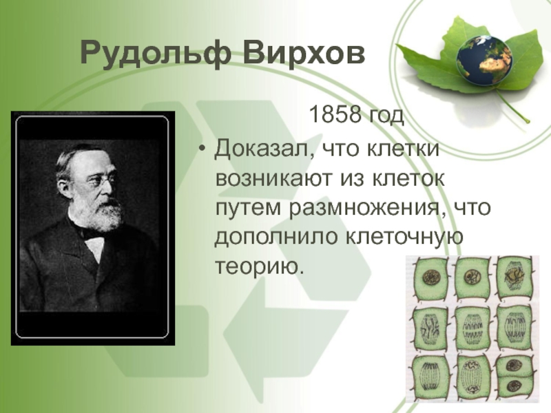 Рудольф Вирхов1858 год Доказал, что клетки возникают из клеток путем размножения, что дополнило клеточную теорию.