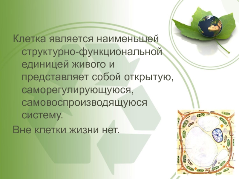 Клетка является наименьшей структурно-функциональной единицей живого и представляет собой открытую, саморегулирующуюся, самовоспроизводящуюся систему.Вне клетки жизни нет.