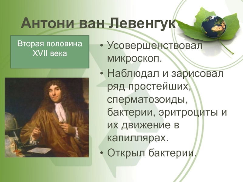 Антони ван ЛевенгукУсовершенствовал микроскоп.Наблюдал и зарисовал ряд простейших, сперматозоиды, бактерии, эритроциты и их движение в капиллярах.Открыл бактерии.