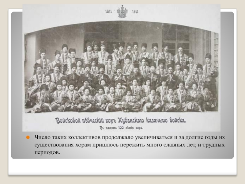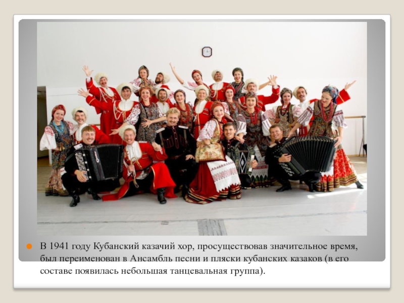 Слайд 9В 1941 году Кубанский казачий хор, просуществовав значительное время, был