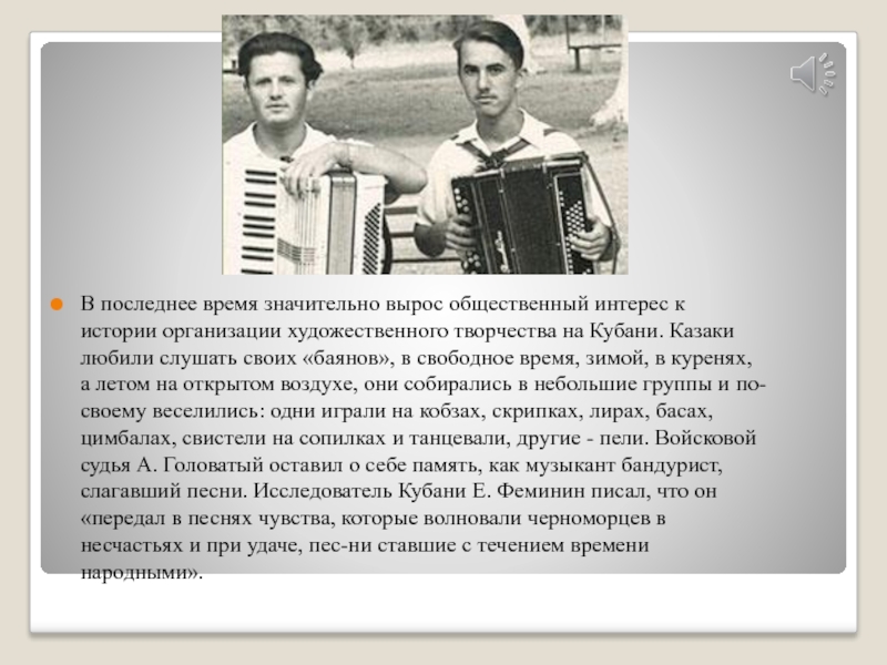 художественного творчества на Кубани. Казаки любили слушать своих «баянов», в