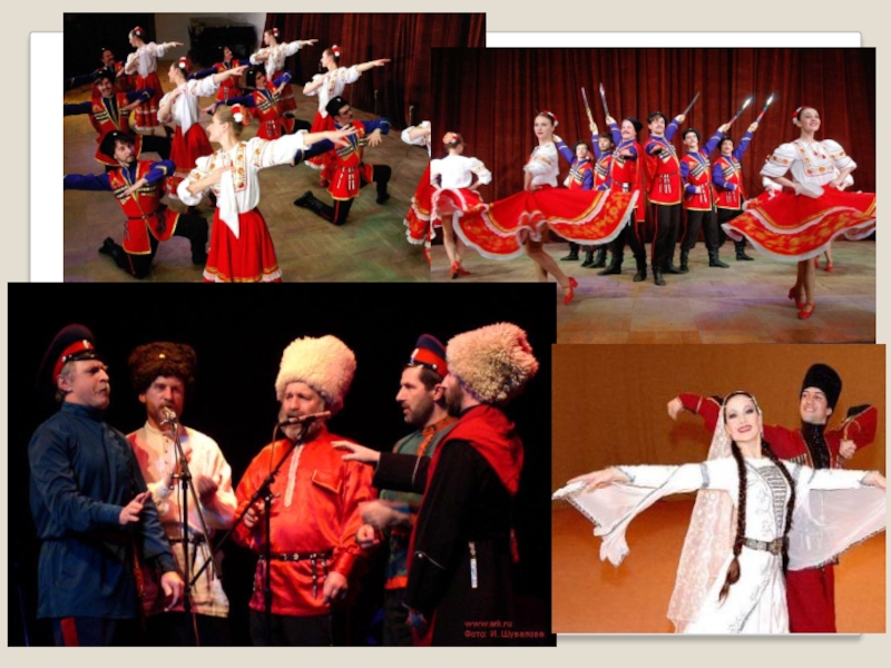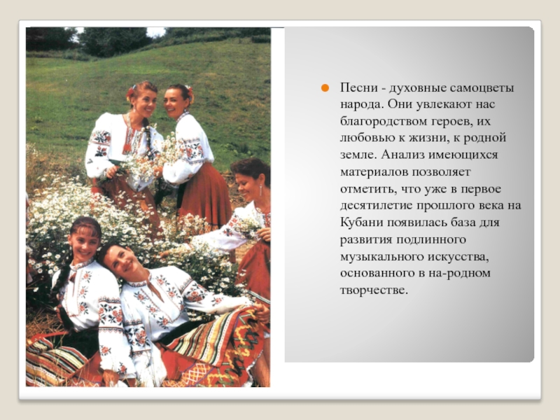 народно-песенных традициях Кубани. Особенно это касается казачьего фольклора, где огромное число исторических, бытовых, лирических, шуточных песен. Особое место занимает боевая хоровая песня, в которой отразились психология и быт казака-воина, защитника Отечества.