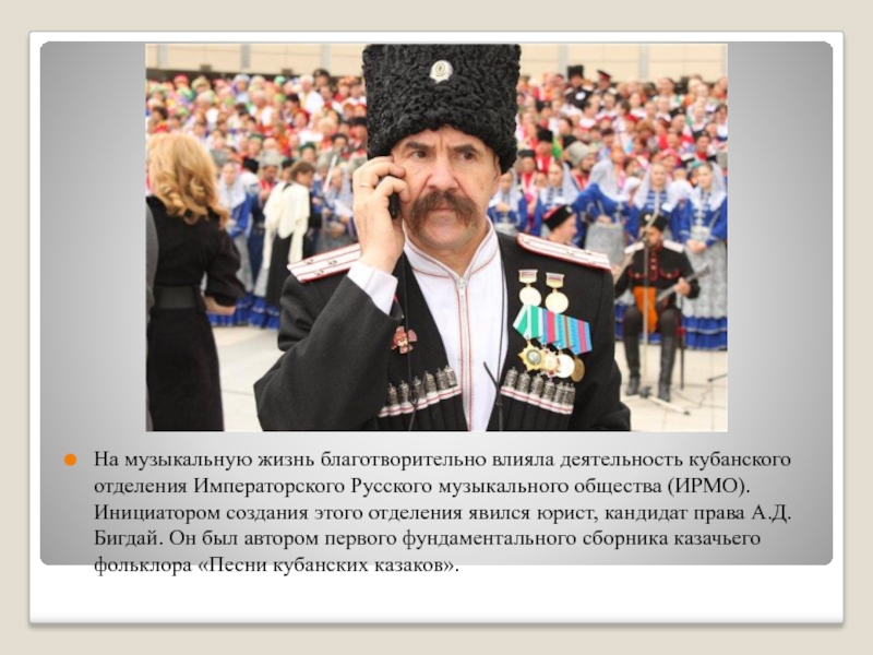 Слайд 14На музыкальную жизнь благотворительно влияла деятельность кубанского отделения Императорского Русского