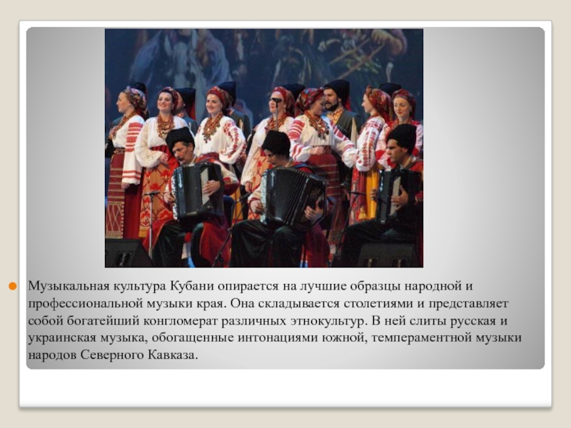Слайд 6Музыкальная культура Кубани опирается на лучшие образцы народной и профессиональной
