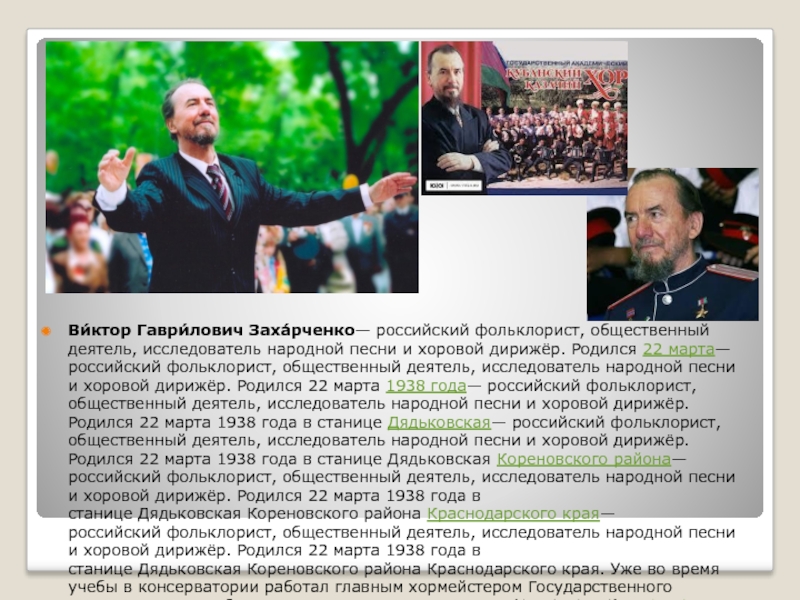 и хоровой дирижёр. Родился 22 марта 1938 года— российский фольклорист, общественный деятель, исследователь народной песни и хоровой дирижёр. Родился 22 марта 1938 года в станице Дядьковская— российский фольклорист, общественный деятель, исследователь народной песни и хоровой дирижёр. Родился 22 марта 1938 года в станице Дядьковская Кореновского района— российский фольклорист, общественный деятель, исследователь народной песни и хоровой дирижёр. Родился 22 марта 1938 года в станице Дядьковская Кореновского района Краснодарского края— российский фольклорист, общественный деятель, исследователь народной песни и хоровой дирижёр. Родился 22 марта 1938 года в станице Дядьковская Кореновского района Краснодарского края. Уже во время учебы в консерватории работал главным хормейстером Государственного академического Сибирского русского народного хора (1964—1974). С 1974 года— российский фольклорист, общественный деятель, исследователь народной песни и хоровой дирижёр. Родился 22 марта 1938 года в станице Дядьковская Кореновского района Краснодарского края. Уже во время учебы в консерватории работал главным хормейстером Государственного академического Сибирского русского народного хора (1964—1974). С 1974 года— художественный руководитель Государственного академического Кубанского казачьего хора. В Союз композиторов СССР— российский фольклорист, общественный деятель, исследователь народной песни и хоровой дирижёр. Родился 22 марта 1938 года в станице Дядьковская Кореновского района Краснодарского края. Уже во время учебы в консерватории работал главным хормейстером Государственного академического Сибирского русского народного хора (1964—1974). С 1974 года— художественный руководитель Государственного академического Кубанского казачьего хора. В Союз композиторов СССР был принят как музыковед и фольклорист. Получил множество наград и почётных званий в сфере культуры