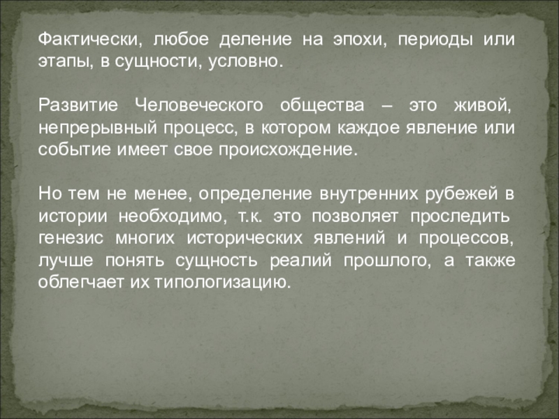 Но тем не менее, определение внутренних рубежей в истории необходимо, т.к. это позволяет проследить генезис многих исторических явлений и процессов, лучше понять сущность реалий прошлого, а также облегчает их типологизацию.