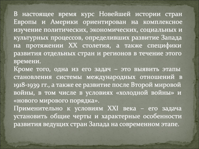 Применительно к условиям XXI века – его задача установить общие черты и характерные особенности развития ведущих стран Запада на современном этапе.