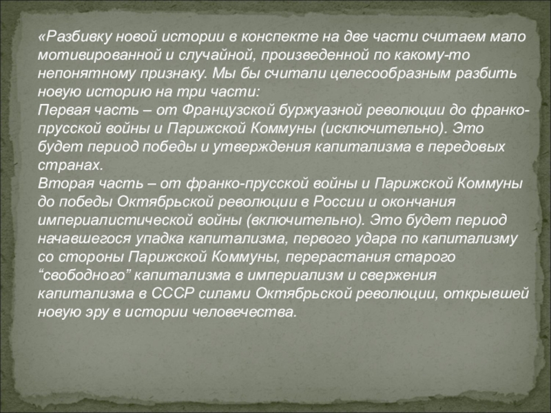 Слайд 29«Разбивку новой истории в конспекте на две части считаем мало