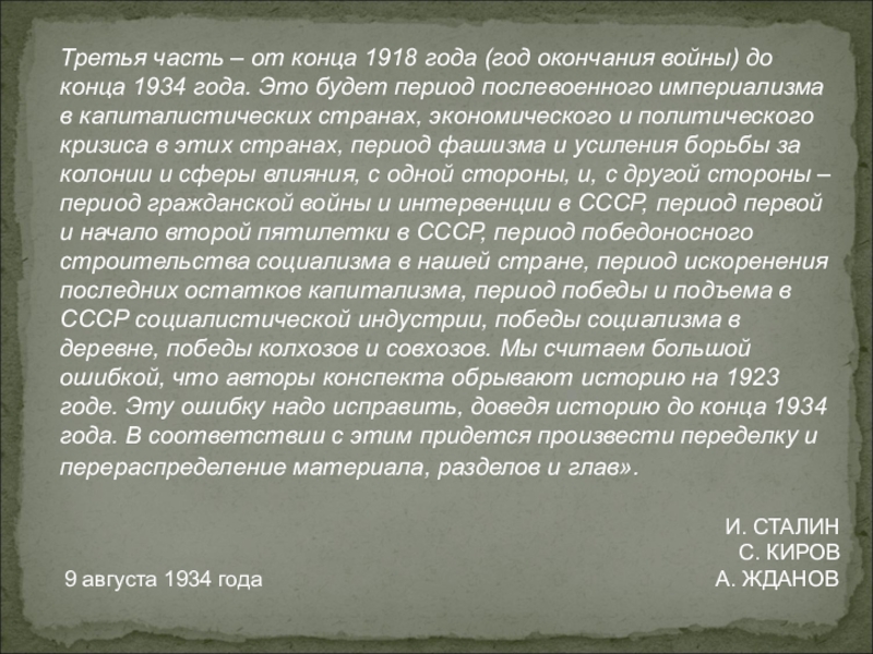 капиталистических странах, экономического и политического кризиса в этих странах, период фашизма и усиления борьбы за колонии и сферы влияния, с одной стороны, и, с другой стороны – период гражданской войны и интервенции в СССР, период первой и начало второй пятилетки в СССР, период победоносного строительства социализма в нашей стране, период искоренения последних остатков капитализма, период победы и подъема в СССР социалистической индустрии, победы социализма в деревне, победы колхозов и совхозов. Мы считаем большой ошибкой, что авторы конспекта обрывают историю на 1923 годе. Эту ошибку надо исправить, доведя историю до конца 1934 года. В соответствии с этим придется произвести переделку и перераспределение материала, разделов и глав».