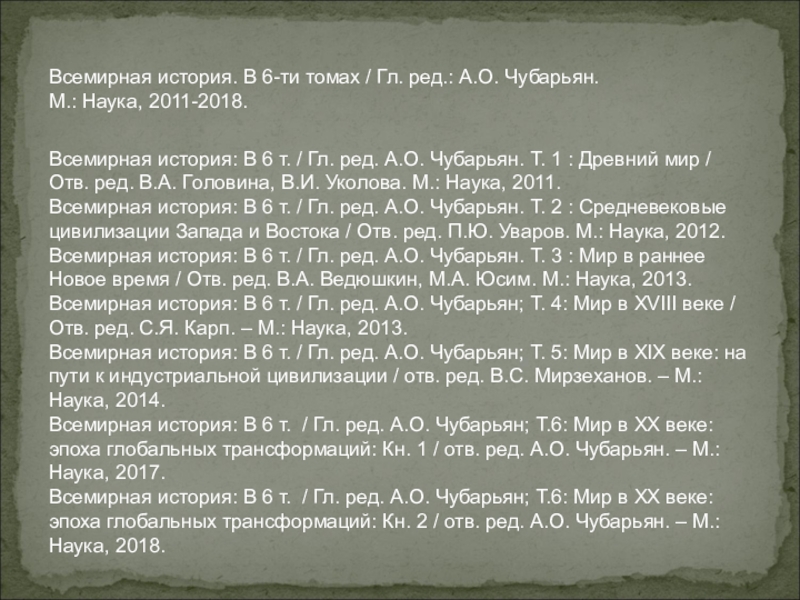 Слайд 7Всемирная история. В 6-ти томах / Гл. ред.: А.О. Чубарьян.
