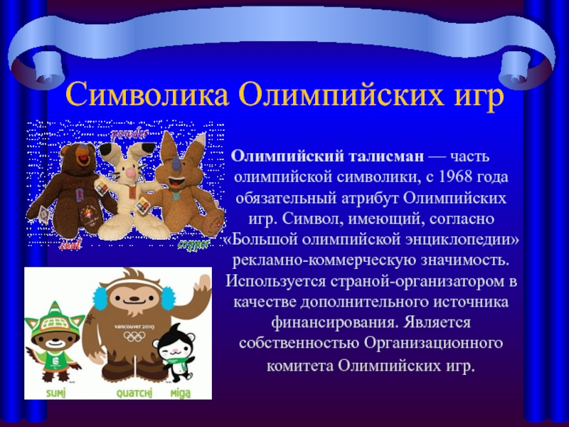 энциклопедии» рекламно-коммерческую значимость. Используется страной-организатором в качестве дополнительного источника финансирования. Является собственностью Организационного комитета Олимпийских игр.