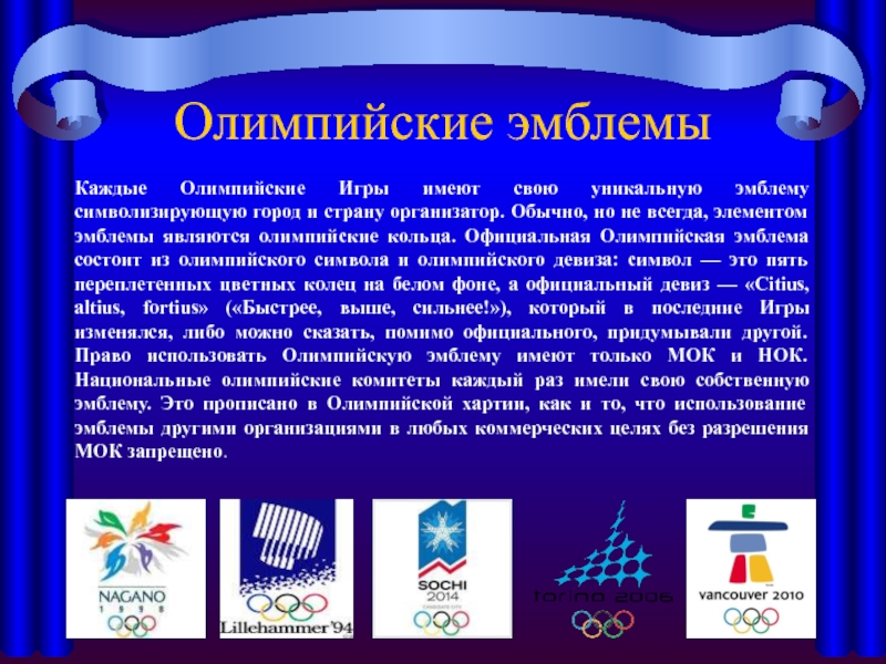 олимпийские кольца. Официальная Олимпийская эмблема состоит из олимпийского символа и олимпийского девиза: символ — это пять переплетенных цветных колец на белом фоне, а официальный девиз — «Citius, altius, fortius» («Быстрее, выше, сильнее!»), который в последние Игры изменялся, либо можно сказать, помимо официального, придумывали другой. Право использовать Олимпийскую эмблему имеют только МОК и НОК. Национальные олимпийские комитеты каждый раз имели свою собственную эмблему. Это прописано в Олимпийской хартии, как и то, что использование эмблемы другими организациями в любых коммерческих целях без разрешения МОК запрещено.