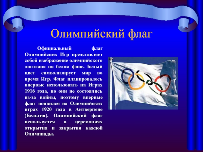 Официальный флаг Олимпийских Игр представляет собой изображение олимпийского логотипа