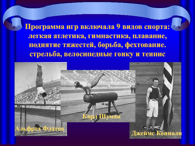 Слайд 19Программа игр включала 9 видов спорта: легкая атлетика, гимнастика, плавание,