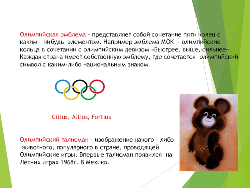 сочетании с олимпийским девизом «Быстрее, выше, сильнее». Каждая страна имеет собственную эмблему, где сочетается олимпийский символ с каким-либо национальным знаком.