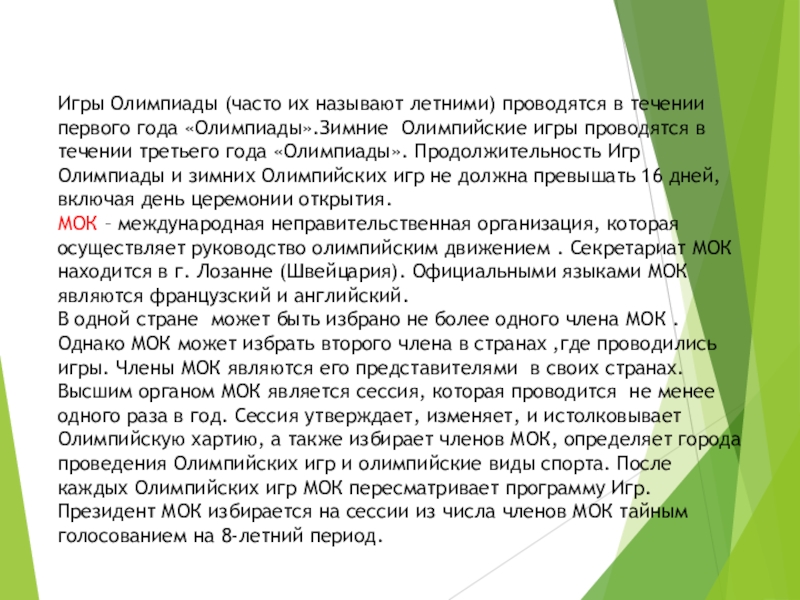 МОК – международная неправительственная организация, которая осуществляет руководство олимпийским движением . Секретариат МОК находится в г. Лозанне (Швейцария). Официальными языками МОК являются французский и английский.