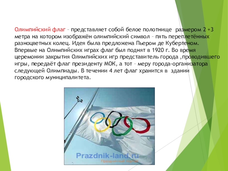 колец. Идея была предложена Пьером де Кубертеном. Впервые на Олимпийских играх флаг был поднят в 1920 г. Во время церемонии закрытия Олимпийских игр представитель города ,проводившего игры, передаёт флаг президенту МОК, а тот – меру города-организатора следующей Олимпиады. В течении 4 лет флаг хранится в здании городского муниципалитета.