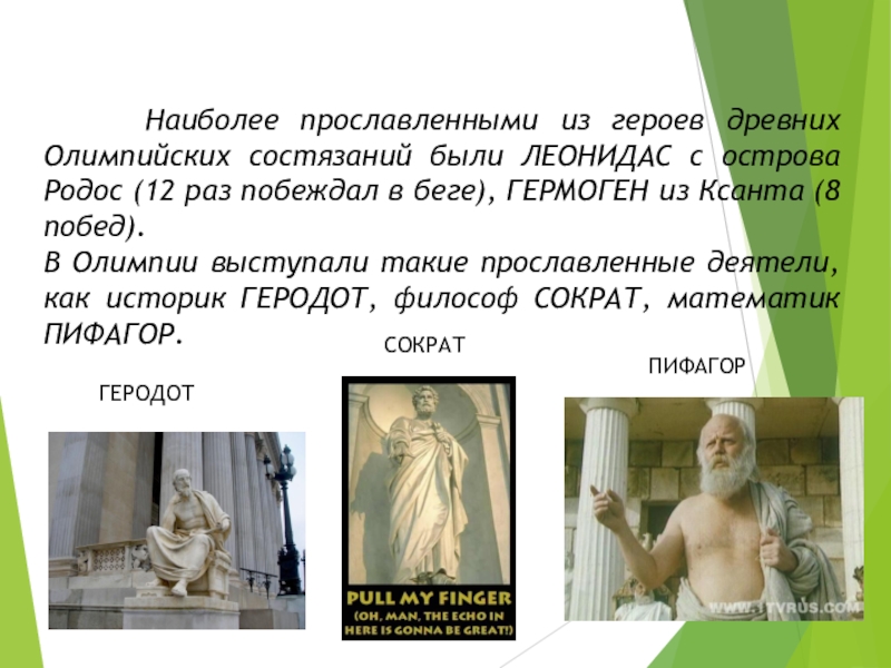 В Олимпии выступали такие прославленные деятели, как историк ГЕРОДОТ, философ СОКРАТ, математик ПИФАГОР.