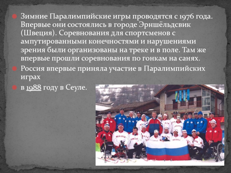Слайд 13Зимние Паралимпийские игры проводятся с 1976 года. Впервые они состоялись