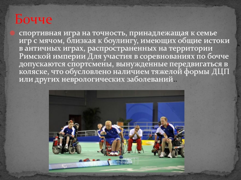 на территории Римской империи Для участия в соревнованиях по бочче допускаются спортсмены, вынужденные передвигаться в коляске, что обусловлено наличием тяжелой формы ДЦП или других неврологических заболеваний..