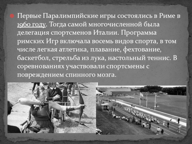 Слайд 10Первые Паралимпийские игры состоялись в Риме в 1960 году. Тогда