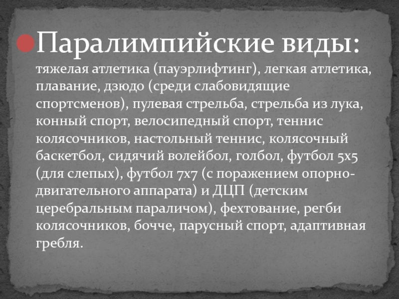 Слайд 14Паралимпийские виды: тяжелая атлетика (пауэрлифтинг), легкая атлетика, плавание, дзюдо (среди