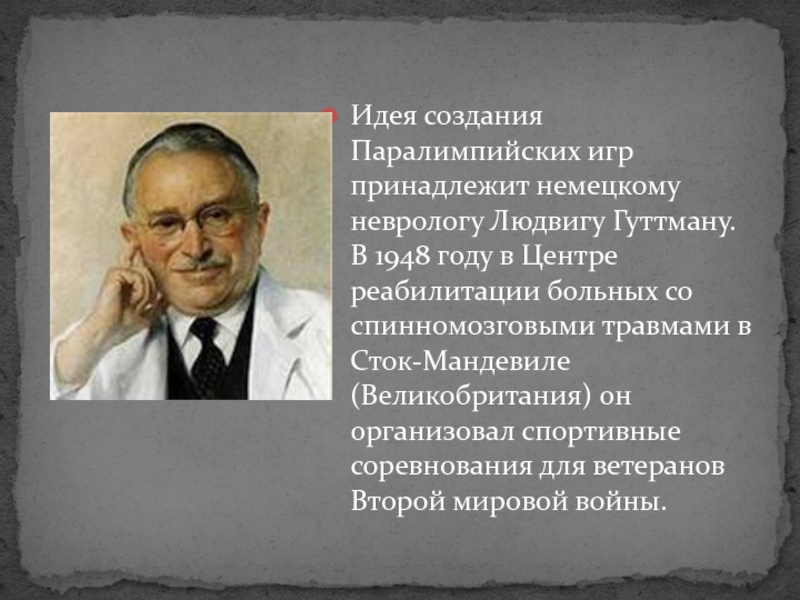 Слайд 9Идея создания Паралимпийских игр принадлежит немецкому неврологу Людвигу Гуттману. В