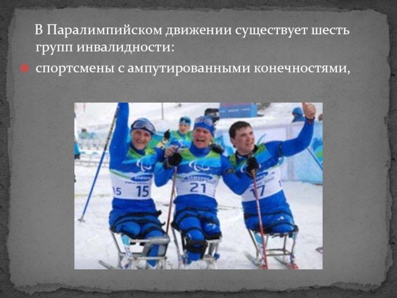 Слайд 4 В Паралимпийском движении существует шесть групп инвалидности: