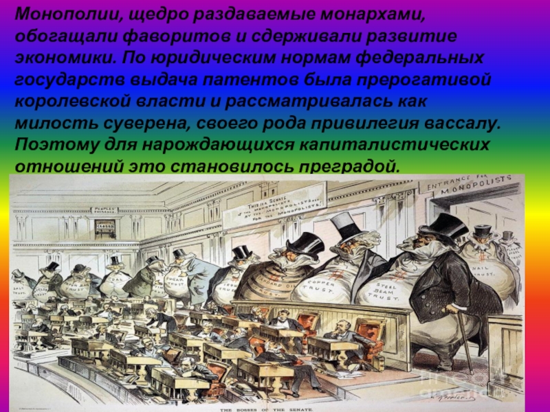 Слайд 8Монополии, щедро раздаваемые монархами, обогащали фаворитов и сдерживали развитие экономики.