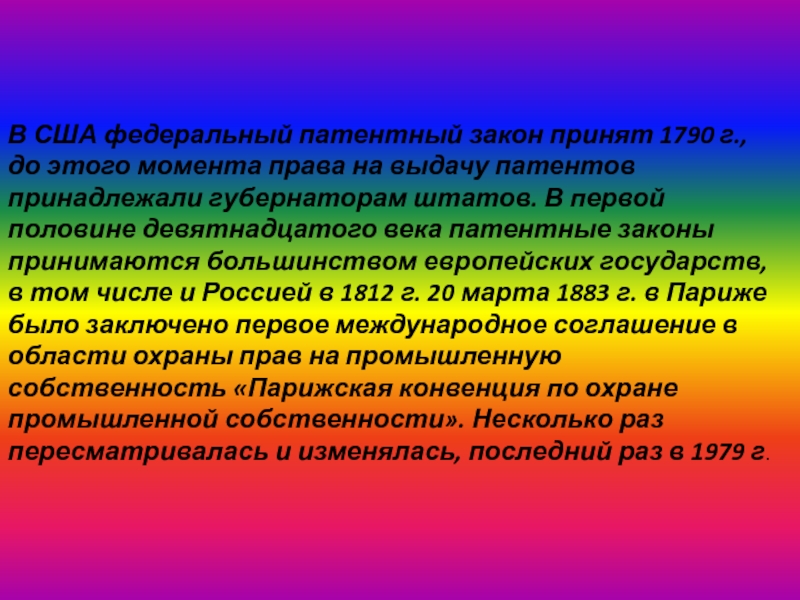 Слайд 10В США федеральный патентный закон принят 1790 г., до этого