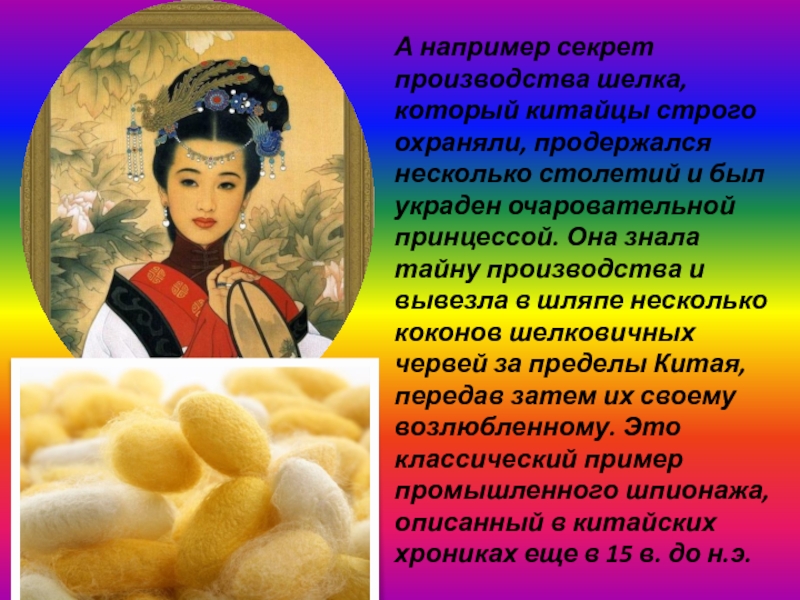 Слайд 5А например секрет производства шелка, который китайцы строго охраняли, продержался