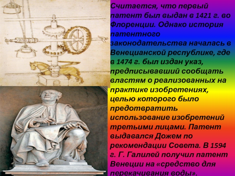 в 1474 г. был издан указ, предписывавший сообщать властям о реализованных на практике изобретениях, целью которого было предотвратить использование изобретений третьими лицами. Патент выдавался Дожем по рекомендации Совета. В 1594 г. Г. Галилей получил патент Венеции на «средство для перекачивания воды».