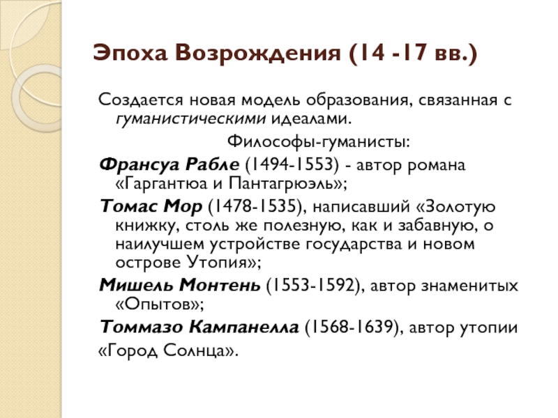 Слайд 14Эпоха Возрождения (14 -17 вв.)
