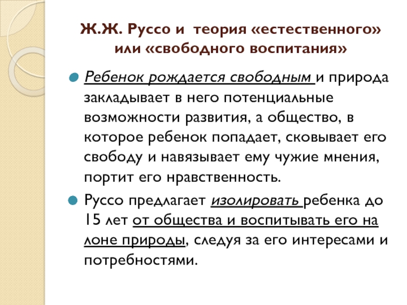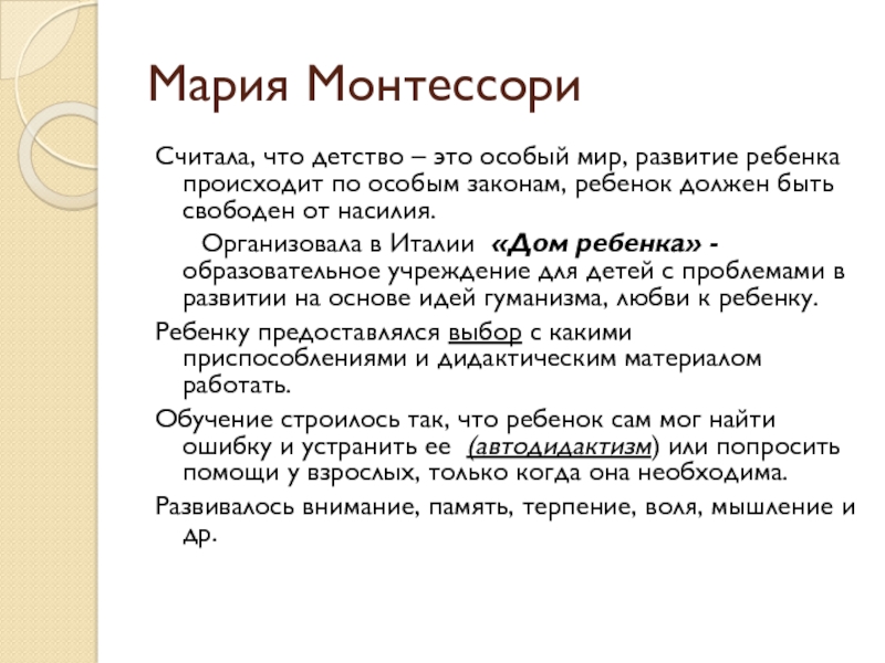 Мария Монтессори (1870 – 1952) – развивала идеи «свободного воспитания».