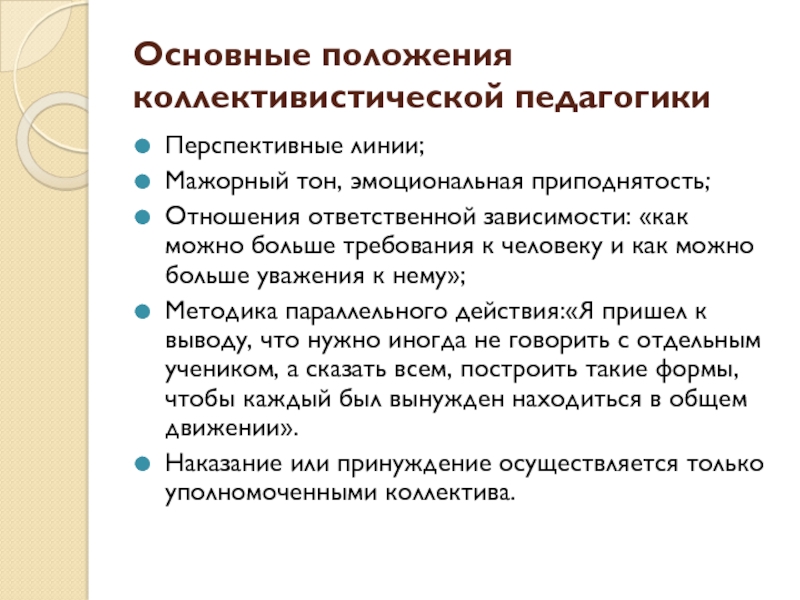 Методика параллельного действия:«Я пришел к выводу, что нужно иногда не говорить с отдельным учеником, а сказать всем, построить такие формы, чтобы каждый был вынужден находиться в общем движении».