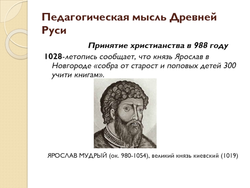 князь Ярослав в Новгороде «собра от старост и поповых детей 300 учити книгам».