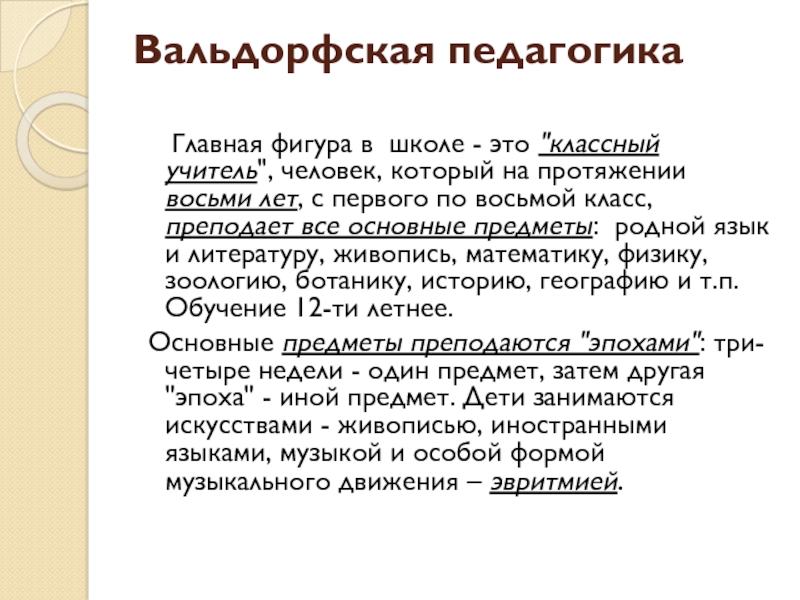 Основные предметы преподаются "эпохами": три-четыре недели - один предмет, затем другая "эпоха" - иной предмет. Дети занимаются искусствами - живописью, иностранными языками, музыкой и особой формой музыкального движения – эвритмией.